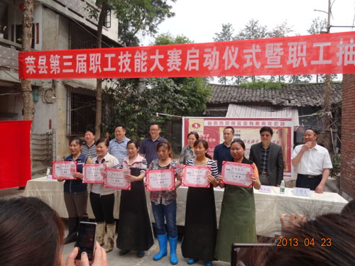 2013年4月23日榮縣第三屆職工技能大賽啟動(dòng)儀式暨職工抽絲比賽在自貢榮成實(shí)業(yè)公司隆重舉行,圖為大賽獲獎(jiǎng)職工。