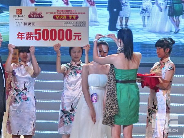 由桐鄉(xiāng)市廣播電視臺、桐鄉(xiāng)長威置業(yè)有限公司聯(lián)合主辦的“桐鄉(xiāng)國際蠶絲城杯”2011蠶花仙子評選暨央視網(wǎng)絡(luò)劇攝制基地演員征選活動的總決賽,于6月12日晚7點半在桐鄉(xiāng)市科技會展中心大劇院精彩對決。10名仙子通過服裝秀、團(tuán)隊秀、才藝秀等風(fēng)采展示,激烈角逐出冠亞季軍。