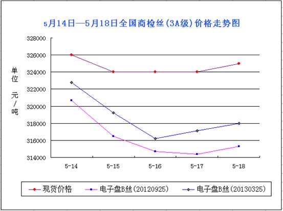 從圖表中可以看出,繭絲市場(chǎng)先跌后回暖,但回暖力度微弱,為市場(chǎng)區(qū)間盤(pán)整,且整體弱勢(shì)未改。本周價(jià)格:周初國(guó)內(nèi)3A級(jí)商檢絲現(xiàn)貨均價(jià)326000元/噸左右,隨后出現(xiàn)下跌,并且震蕩,后又落入困境。周末有微幅回調(diào),均價(jià)在325000元/噸左右,整體跌1000元/噸左右。5月以來(lái),廣西新繭的消息尤為熱門(mén),前期由于新繭收購(gòu)價(jià)較高,因此繭絲市場(chǎng)曾受到支撐影響,且就算以后的下跌也基本做盤(pán)整,整體價(jià)格均在32.5萬(wàn)/噸以上,且高價(jià)位依然在33萬(wàn)/噸以上,而隨著5月中旬以來(lái),溫度的升高,雨水的加多,后來(lái)批次的繭子質(zhì)量顯然有所下降,因此收購(gòu)價(jià)也有所降低,價(jià)值市場(chǎng)方面的自行調(diào)整——量大價(jià)賤,以此影響下游絲價(jià)的逐步走低,且價(jià)格段也落入32.5萬(wàn)/噸以內(nèi)。而就今年的繭絲市場(chǎng)來(lái)看,5月 13日召開(kāi)的繭絲綢座談會(huì)上又相關(guān)人士認(rèn)為,今年的繭絲行情可待,整體比較樂(lè)觀。只要從新繭收購(gòu)價(jià)格以及國(guó)際金融市場(chǎng)方面做了分析。上周末,嘉興春蠶順利進(jìn)入五齡期,這就意味著,5月下旬開(kāi)始,江浙一代的春繭也將陸續(xù)上市,再次沖擊下,繭絲市場(chǎng)或再次陷入膠著狀態(tài)——新繭收購(gòu)價(jià)支撐VS企業(yè)加大采購(gòu)市場(chǎng)流通量增加。此一來(lái),近期絲價(jià)勢(shì)必再次進(jìn)入動(dòng)蕩盤(pán)整期。