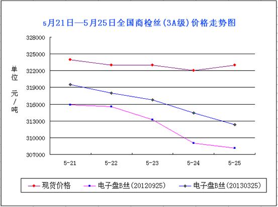 從表中可以看出,本周以來,現(xiàn)貨市場(chǎng)整體弱勢(shì),繭絲有探底跡象,然而卻受外部利空因素制約,探底不成,周末價(jià)格有所盤旋,不過卻無回暖跡象,市場(chǎng)煞是悲涼。本周價(jià)格:國內(nèi)3A級(jí)商檢絲現(xiàn)貨均價(jià)周初324000元/噸左右,隨后價(jià)格一路走低,周末均價(jià)在323000元/噸左右,整體漲1000元/噸左右。從市場(chǎng)方面來看,廣西市場(chǎng)價(jià)格整體波動(dòng)開始減小,整體在32—32.5萬/噸之間波動(dòng);嘉興市場(chǎng)價(jià)位差較為明顯,市場(chǎng)波動(dòng)大。據(jù)坊間消息,本周以來,廣西地區(qū)新繭繼續(xù)上市,現(xiàn)在已經(jīng)是二批新繭了,而在質(zhì)量上開始有所下降,因此價(jià)格也受到影響,收購價(jià)基本在35—36元/公斤左右,比之前期收購價(jià)降低。江浙一帶的新繭也開始上市,但據(jù)悉東部地區(qū)產(chǎn)量有所下降:浙江省春蠶飼養(yǎng)量同比有所下降,江蘇省減11%,山東省減少15%。據(jù)此消息來看,今年整體的產(chǎn)量或有所下降。外圍消息, 5月24日,中央電視臺(tái)財(cái)經(jīng)頻道,去年5月份以來,繭絲價(jià)格的上下波動(dòng)也讓外貿(mào)出口企業(yè)難以應(yīng)付。出口訂單銳減,不少絲綢企業(yè)賠了本。由此不難看出,今年整個(gè)繭絲市場(chǎng)又將是一個(gè)艱難年。