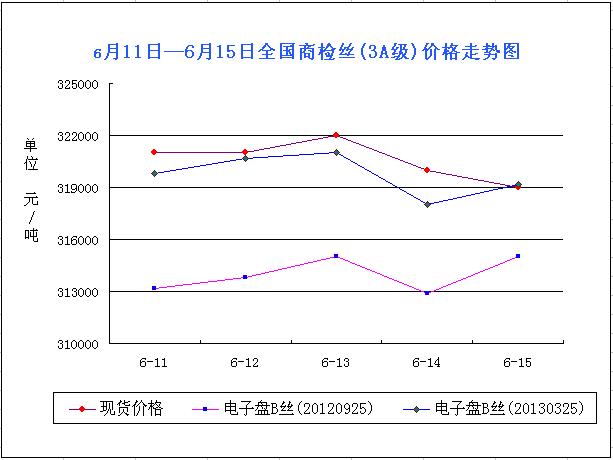 從圖表可以看出,本周現(xiàn)貨市場動蕩前行,漲跌不定,周初開始對比上周價格為漲,且好勢維系了幾天,不過進入周中,市場開始延續(xù)這段時期的弱勢,近至周末,價格低位落入32萬/噸以內(nèi)。本周價格:國內(nèi)3A級商檢絲現(xiàn)貨均價周初321000元/噸左右,隨后價格一路微幅動蕩,周末均價在319000元/噸左右,整體跌價2000元/噸。本周價格走動有些稍大,此行情足以說明繭絲市場如今依然處于疲軟期。由本周的走勢來看,一是,繭絲上漲的動力很明顯依然不足,或者還未出現(xiàn)動力;二受外圍一些因素影響,市場會不定的做一些盤整,而這并不意味著繭絲市場已經(jīng)探底回暖,弱勢之路還有待商討;再有就是盤面的走動,所謂現(xiàn)貨決定盤面,盤面影響現(xiàn)貨,在基礎(chǔ)上,不難看出近期現(xiàn)貨市場和盤面的走動基本如出一撤,只是時間相差問題。近期有新繭收購這反應(yīng),隨著繭絲價格的跌價,下游絲廠對干繭的采購呈觀望態(tài)度,即便是采購也是處于賒賬購貨,將風險順至絲廠和個體干繭儲存戶,此舉對繭絲市場發(fā)展更為不利。隨著廣西一帶四批新繭的上市,江浙等地二三批繭子的上市,短期內(nèi)繭絲市場或依然收到新品上市的影響,據(jù)有介紹,近期的新繭受質(zhì)量和行業(yè)因素影響,收購價仍會降低。