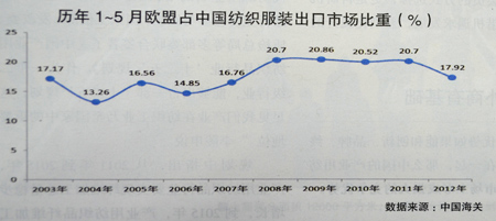 據(jù)中國海關數(shù)據(jù)顯示,2012年1—5月,我國紡織品服裝出口935.23億美元,同比增長2.63%。其中,對歐盟出口167.56億美元,占我國紡織品服裝對全球出口總額的17.92%,同比下降11.17%。歐盟作為我國紡織品服裝出口的主要市場之一,對其出口額出現(xiàn)負增長的局面,凸顯了歐盟市場的嚴峻態(tài)勢。