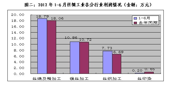 2012年1—6月,據(jù)國家統(tǒng)計局對940家絲絹紡織及精加工規(guī)模以上工業(yè)企業(yè)統(tǒng)計,工業(yè)總產(chǎn)值529.61 億元,同比增長13.92%;銷售產(chǎn)值513.92億元,同比增長12.93%;主營業(yè)務(wù)收入505.7億元,同比增長12.27%;利潤18.8億元,同比增長4.06%,其中繅絲加工實現(xiàn)利潤10.85億元,同比增長1.25%,絲織加工實現(xiàn)利潤7.73億元,同比增長15.56%,絲印染加工實現(xiàn)利潤0.2億元,同比下降68.24%。自2011年11月整個絲綢工業(yè)經(jīng)濟增速出現(xiàn)明顯拐點以來,今年上半年繼續(xù)呈現(xiàn)回落態(tài)勢(見圖一),1-6月工業(yè)總產(chǎn)值增速較去年11月回落12.37%。