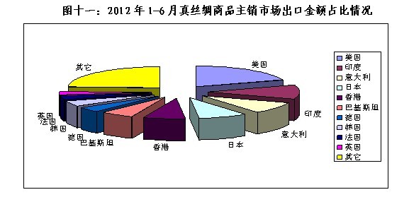 5、對主銷市場出口全線下降。從對主銷市場出口金額情況看(見表二、圖十),除巴基斯坦和香港分別實現(xiàn)17.14和7.9%的增長外,對傳統(tǒng)主銷四大市場美國、印度、意大利、日本出口金額下降幅度較大,分別同比下降8.27%、22.89%、25.35%和11.79%,其份額幾乎占據(jù)整個市場的50%(見圖十一);對德、韓、英、法等國家出口也是負增長。絲綢出口市場前十位的國家和地區(qū)出現(xiàn)80%的大面積負增長,如此低迷的格局屬近年來罕見。