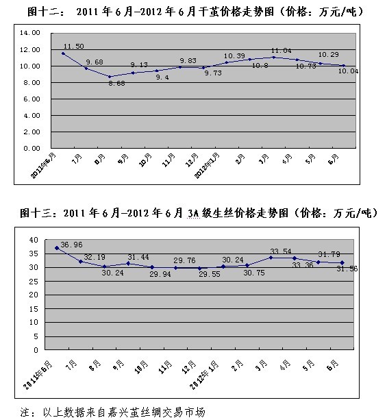 2012年以來,受出口市場不暢,國內(nèi)蠶繭供應(yīng)充足,繅絲企業(yè)收縮產(chǎn)能等因素的影響,繭絲價格基本維持窄幅震蕩趨勢。截止到6月底,國內(nèi)干繭和生絲價格分別為:10.04萬元/噸和31.56萬元/噸。干繭價格較年初下降0.82%,生絲價格較年初僅有5.75%的增長,相對于去年上半年價格暴漲行情,今年上半年繭絲市場基本穩(wěn)定(見圖十二、圖十三)。