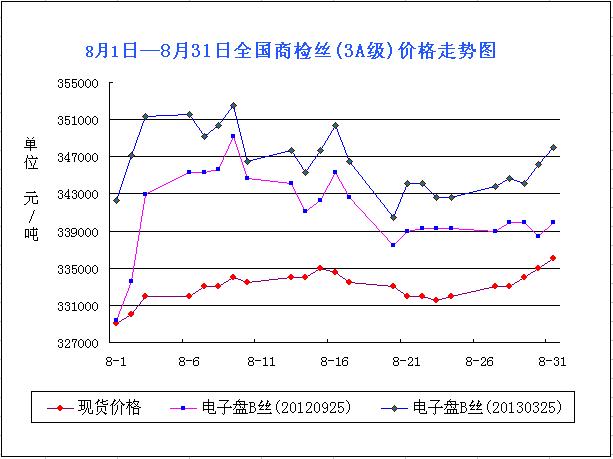 從圖表可以看出,本月現(xiàn)貨市場(chǎng)整體情況算平穩(wěn),前后差價(jià)不高,高低價(jià)位間也未能破萬(wàn)。具體走勢(shì)來(lái)看:月初到8月10日左右,為上漲趨勢(shì),隨后價(jià)格穩(wěn)固,知道8月15日價(jià)格沖高點(diǎn)后急劇下跌,到8月23日左右,行情落至低位,但是這個(gè)價(jià)格依然高于月初價(jià)格,隨后本月繭絲現(xiàn)貨真正直漲的局面展開(kāi),至8月末,現(xiàn)貨市場(chǎng)順利登頂本月峰值,均價(jià)33.6萬(wàn)/噸以上。從市場(chǎng)走勢(shì)不難看出,本周秋繭的影響起到最大作用。本月以來(lái),秋繭從發(fā)種,到桑蠶管理,到頻頻傳出的發(fā)種量減少,而至今日期間逐漸上市,這一系列的消息都在時(shí)刻影響著繭絲市場(chǎng)的走勢(shì)。秋繭開(kāi)始生產(chǎn),市場(chǎng)出現(xiàn)回落,隨著今日秋繭收購(gòu)開(kāi)始,并且一批繭子的價(jià)格處于高位,這在一定程度上支撐了繭絲市場(chǎng)的走高;另外,處于新舊交替的關(guān)口,繭絲綢行業(yè)也有所改善,市場(chǎng)得到支撐,還有國(guó)家的政策支持,據(jù)悉, 8月末國(guó)家2億元的繭絲綢行業(yè)支持款項(xiàng)已經(jīng)下?lián),這樣一來(lái),對(duì)于國(guó)內(nèi)的繭絲市場(chǎng)來(lái)講無(wú)疑極為振奮。而就近期的市場(chǎng)來(lái)看,繭絲雖然開(kāi)始迅速回暖,但大的趨勢(shì)卻不樂(lè)觀,首先隨著新繭的大量上市,將對(duì)下游造成沖擊;另外消費(fèi)市場(chǎng)仍然處于疲軟中,市場(chǎng)真正的支撐并未到來(lái)。