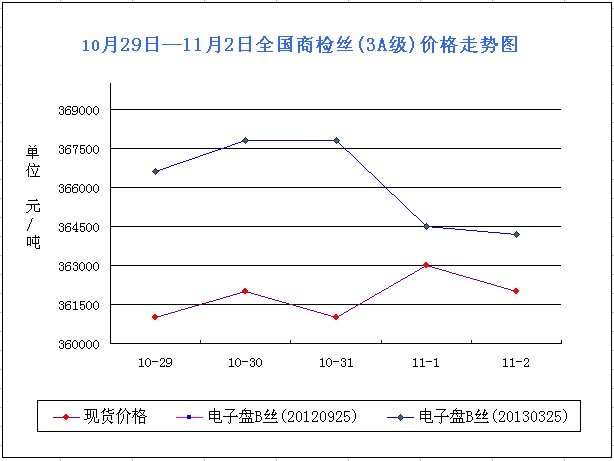 從圖表可以看出,本周現(xiàn)貨市場(chǎng)走勢(shì)并不大,并且整體的價(jià)位都處在36萬(wàn)/噸以上盤整,價(jià)格位依然處在高位區(qū)間。據(jù)坊間消息,進(jìn)入11月份以來,秋繭收購(gòu)基本進(jìn)入尾聲,大都是最后一批尾繭正在準(zhǔn)備期。在此之前,10月末的時(shí)候,各地四批秋繭也基本收購(gòu)?fù)瓿,?jù)悉廣西第四批秋繭收購(gòu)價(jià)格繼續(xù)保持高位運(yùn)行勢(shì)頭,基本保持在43—45元/公斤左右,繭本在12萬(wàn)/噸左右;而江浙一帶晚秋繭陸續(xù)上市,據(jù)反映產(chǎn)量縮水較大,由于桑葉不足,蠶繭顆粒小,繭質(zhì)較差,收購(gòu)價(jià)基本保持在36元/公斤左右。產(chǎn)業(yè)鏈方面,綜合市場(chǎng),上游產(chǎn)能過剩,原料減產(chǎn),上游階段原料供求的不平衡,直接導(dǎo)致了上游企業(yè)的看漲或被迫看漲。而下游的產(chǎn)銷形勢(shì)也難容樂觀,看空情緒較重。產(chǎn)量上看,雖然秋繭還未真正意義上的完結(jié),但各方基本已經(jīng)明確,今年新繭產(chǎn)量減產(chǎn)大概在三至四成。