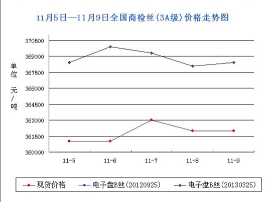 圖表可以看出,本周繭絲現(xiàn)貨市場走勢較為平緩,基本依然延續(xù)高位震蕩,價格高不上,低不下,盤踞高位膠著。從本周價格走勢來看,本周均價基本依然在36萬/噸稍看上晃動,整體價格波動在千元左右,并且高位價和低位價相差并不明顯,只是區(qū)間盤整。坊間消息,據(jù)兩廣,四川,江浙一帶統(tǒng)計,本年秋繭收烘工作已經(jīng)進入掃尾階段,產(chǎn)量評估的輪廓也有所顯現(xiàn),市場上的減產(chǎn)論調(diào)基本上占主導(dǎo),不過具體減產(chǎn)多少并沒有具體數(shù)據(jù),然而另一方表明,減產(chǎn)的作用在前期基本已經(jīng)顯示出作用,即助推市場上下游新繭收購上漲,從而導(dǎo)致絲價大幅沖高,而下游終端消費來看,整體形勢未能出現(xiàn)根本轉(zhuǎn)機,絲綢制品的消費依然不是很暢。另外, 11月6日,國家繭絲綢辦在中機國際招標公司舉行了國家儲備廠絲公開競購開價及評審,價格評審委員會通過電子評審系統(tǒng)對所有有效競購報價進行計算,本次國家儲備廠絲公開競購平均競購價格為321950元/噸,實際競購總噸數(shù)為581噸。由此價格可以看出,拋儲的價格遠遠低于現(xiàn)貨的36萬/噸價格,但是似乎這些影響并未能對市場產(chǎn)生較大作用,相關(guān)人士認為這是因為一放儲的量較小,對市場沖擊不大;二是因為本次放儲為2007年生絲,市場流通有限,不一定能沖擊現(xiàn)在的品種生絲,因此市場方并無大影響產(chǎn)生。