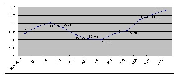 圖11 2012年1-12月干繭價(jià)格走勢圖(價(jià)格:萬元/噸)