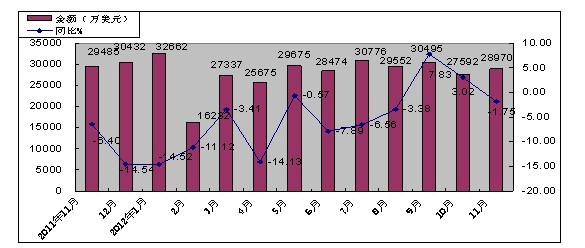 圖5 2011年11月-2012年11月真絲綢商品出口金額走勢情況