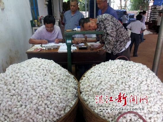 13日上午10時(shí),在徐聞縣下橋鎮(zhèn)信橋村一蠶繭收購站前,10多位蠶農(nóng)正在排隊(duì)賣蠶繭。收購站的蠶繭淺加工車間里,堆滿了白花花的蠶繭。記者從現(xiàn)場(chǎng)了解到,當(dāng)?shù)匦Q繭開始大量上市,而收購價(jià)格已經(jīng)超過了40元一公斤。