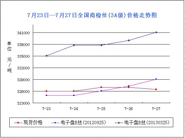 從圖表可以看出,本周現(xiàn)貨市場變化不大,基本都在32.6萬/噸偏右徘徊,整體價格位和上周幾乎沒有差別,唯一變化的而就是本周市場交易再現(xiàn)冷清,大概是經(jīng)過幾周的漲價之后,市場開始平靜,甚至開始回調(diào)。本周價格:國內(nèi)3A級商檢絲現(xiàn)貨均價周初326000元/噸左右,隨后價格小漲,周末均價在326500元/噸左右,整體漲500元/噸。綜合現(xiàn)在的價格來看,繭絲市場行情到現(xiàn)在這個價位已經(jīng)不錯,不論對于下游綢廠服裝廠等,價格成本上壓力也沒那么大了,如果價格能一直這樣平穩(wěn),那么繭絲綢業(yè)將會朝向更好的方向發(fā)展;對于上游來講,絲廠的利益和絲價繭價緊密相關,而繭子的價格又和蠶農(nóng)的收入相連,因此來講,本年來,干繭收購價格整體不差,對蠶農(nóng)來說,收入中規(guī)中矩。另外產(chǎn)量,隨著春繭,夏繭的逐步結(jié)束,市場歸于一方面的平靜也在清理之中,因此近期繭絲市場可謂平靜不少,漲價主要原因則受絲綢消費季的影響,炎熱夏季,正是絲綢產(chǎn)品的熱銷季節(jié),很多人都會在這個季節(jié)選擇絲綢服飾以及絲綢家居服等,另外絲綢家紡床品也開始熱銷。而外圍消息上看,歐美市場依舊如此,唯一值得慶幸的是人民幣對美元匯率有所緩解,此點對于以出口為主的繭絲綢業(yè)來講利處不小。