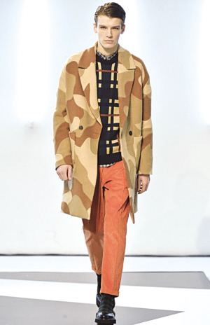 設(shè)計(jì)師們從大量的自然元素,如花卉、動(dòng)物、木材和水中尋找靈感,提取其中的“形”、“質(zhì)”、“色”等元素應(yīng)用于自己的創(chuàng)作中。如果說春夏的自然元素是生機(jī)盎然、充滿浪漫氛圍的,那么本季秋冬倫敦時(shí)裝周的自然元素就是被原始野性所驅(qū)使,灑脫無拘束的。從整體來看,以自然為靈感設(shè)計(jì)的服裝整體顏色以黑白、藍(lán)灰以及土黃色為主,圖案大多為破碎紋理,云絮狀紋理。在Burberry Prorsum本季的男裝系列當(dāng)中,設(shè)計(jì)師Christopher Bailey就是從大自然中尋找設(shè)計(jì)靈感,推出了一系列冬季花朵及葉子的印花圖案,這些圖案不僅被運(yùn)用在襯衫及衛(wèi)衣上,在外套系列設(shè)計(jì)中也得以體現(xiàn);一向以獨(dú)特印花為傲的Etro今年秋冬時(shí)裝周則推出了動(dòng)物圖案拼貼印花,其中以讓人聯(lián)想到李安導(dǎo)演的《少年派的奇幻漂流》中那只威風(fēng)凜凜的“理查德”的老虎印花圖案尤為搶眼。